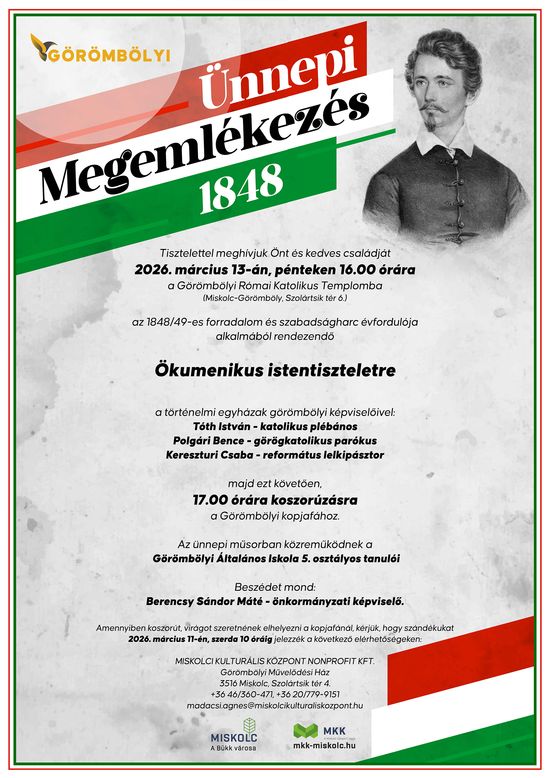 Tisztelettel meghívjuk Önt és kedves családját 2025. március 15-én, szombaton 16:00 órára a Görömbölyi Református Templomba (Miskolc-Görömböly, Lavotta u. 15.) az 1848/49-es forradalom és szabadságharc évfordulója alkalmából rendezendő Ökumenikus istentiszteletre a történelmi egyházak görömbölyi képviselőivel: